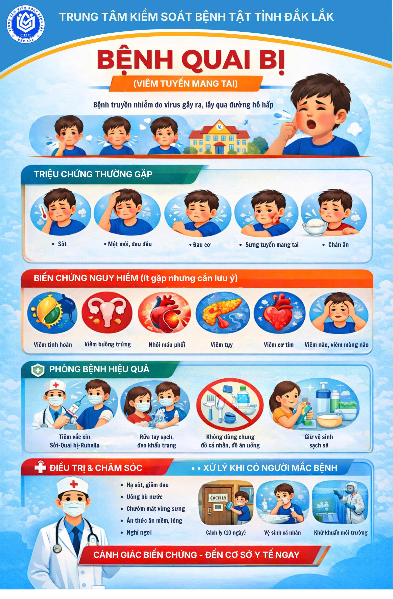 Nhà trường đề nghị học sinh thực hiện giữ gìn vệ sinh cá nhân như: rửa tay thường xuyên với xà phòng; ăn chín uống sôi; tuyệt đối không mua quà và đồ ăn vặt trước cổng trường hoặc các sản phẩm không rõ nguồn gốc. Kính mong phụ huynh cho con em ăn sáng tại nhà, không ăn những đồ ăn không đảm bảo vệ sinh và không rõ nguồn gốc xuất xứ. Khi đi học hoặc đến nơi đông người nên đeo khẩu trang. Khi có dấu hiệu của các bệnh quai bị, thuỷ đậu và tay chân miệng đề nghị quý phụ huynh thông báo với GVCN và cho con nghỉ học để đi khám và điều trị.